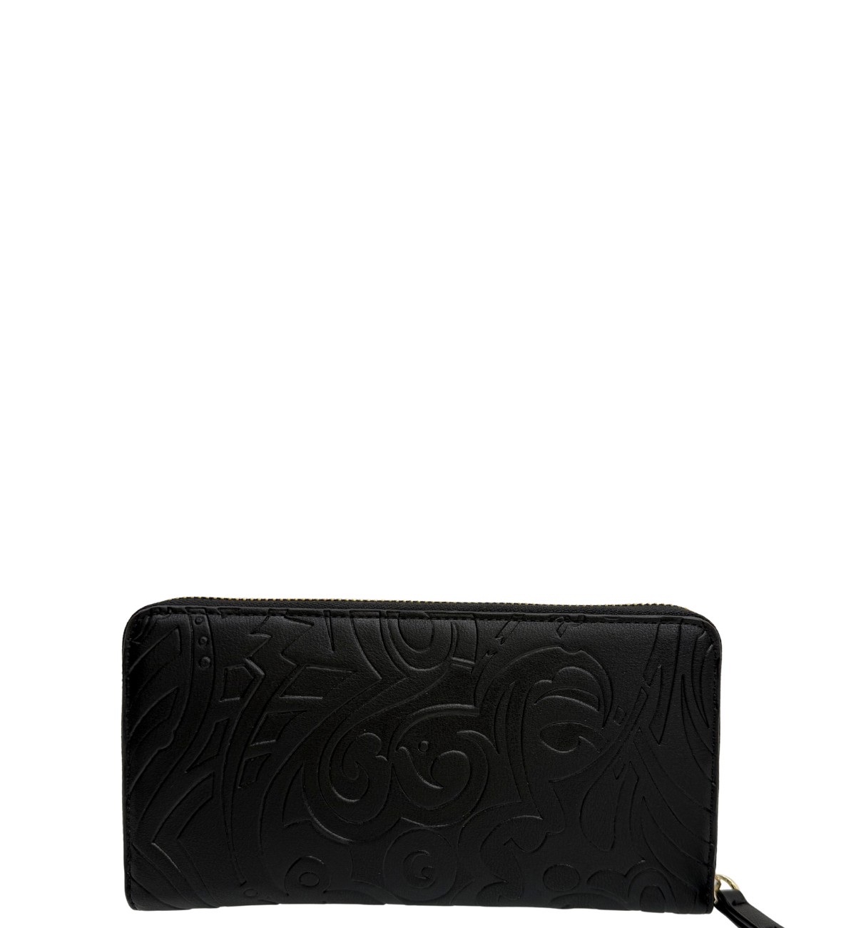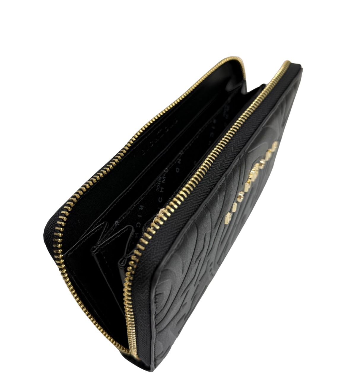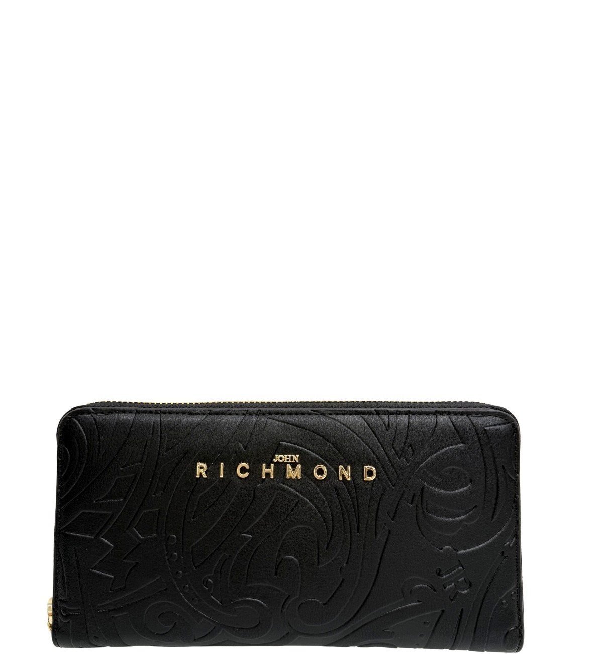Portafoglio John Richmond realizzato in ecopelle con chiusura tramite zip, taschino portamonete interno, vari scomparti portacarte, trama astratta incisa e logo applicato in metallo.