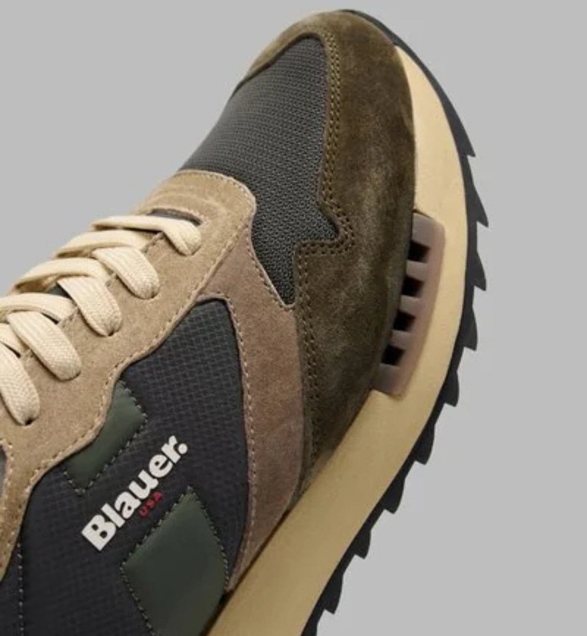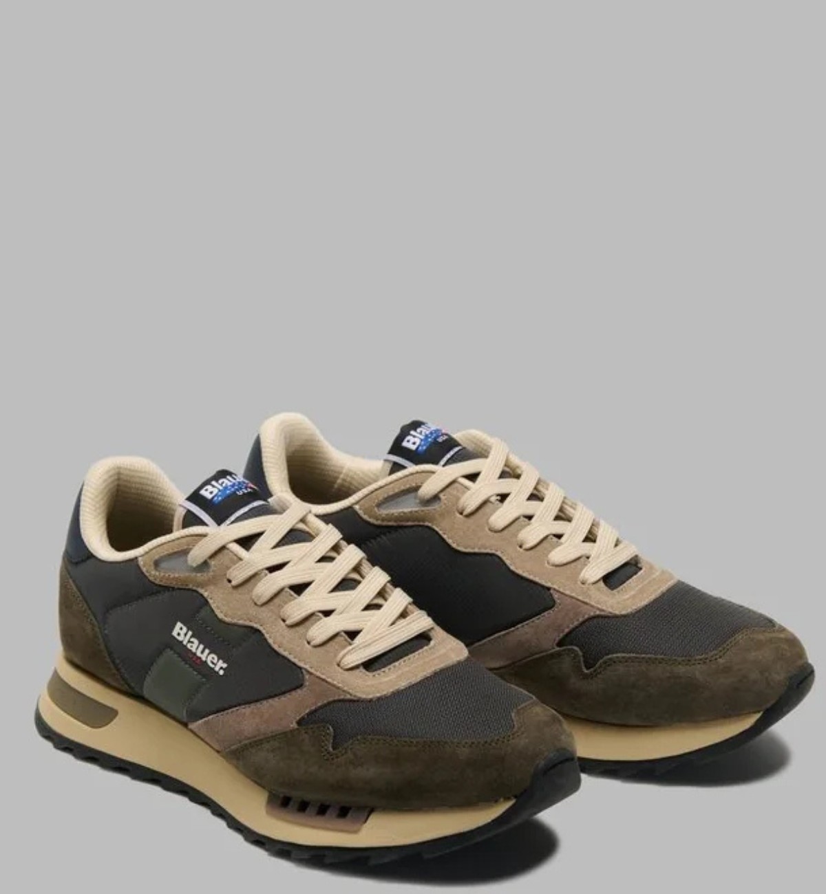 Sneakers RYDER dal design sportivo con un tocco vintage. La tomaia combina materiali diversi, con un effetto cromatico equilibrato, il logo Blauer è visibile lateralmente e sulla linguetta. La suola in eva con elementi a contrasto, è seghettata per un look dinamico