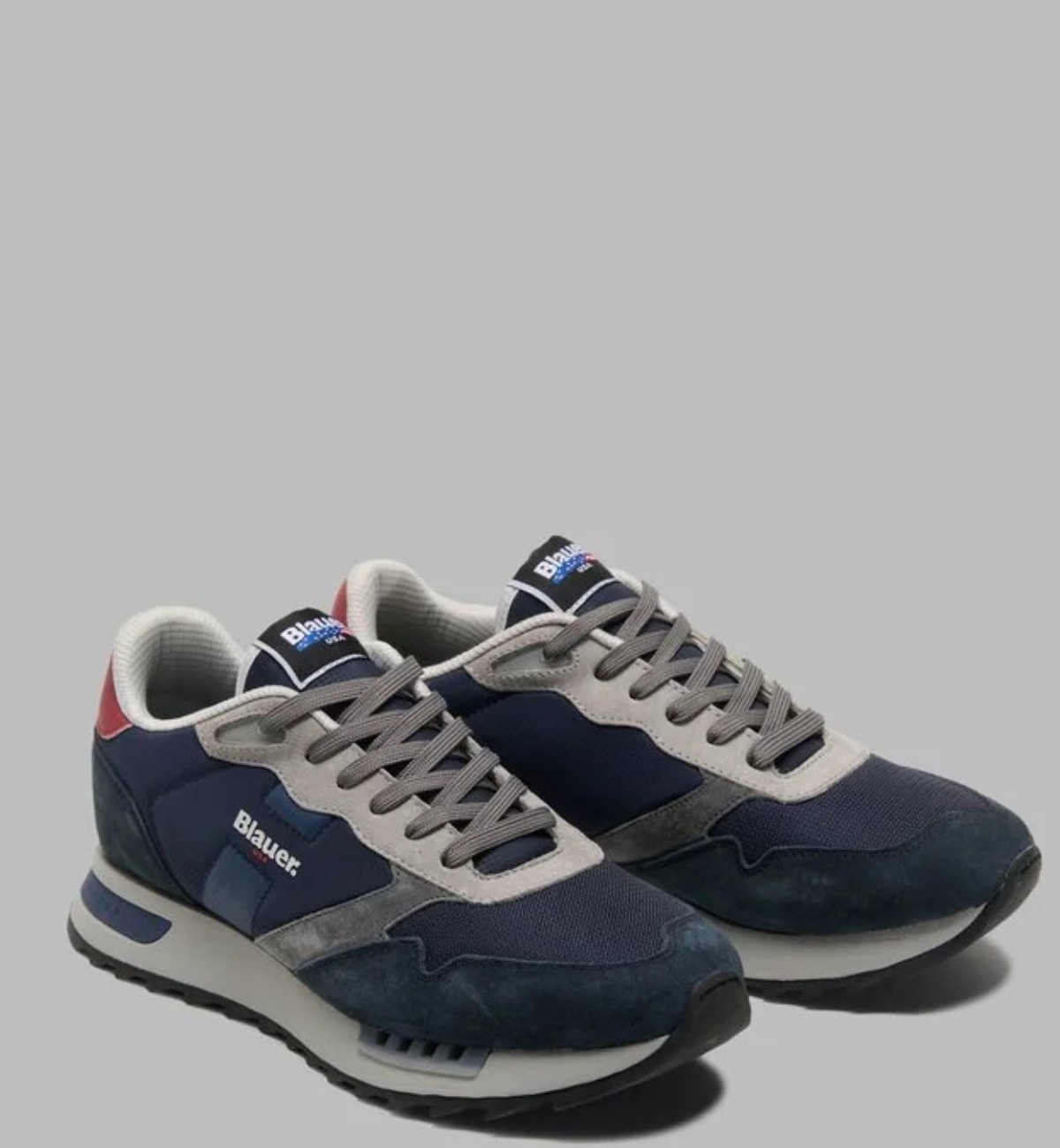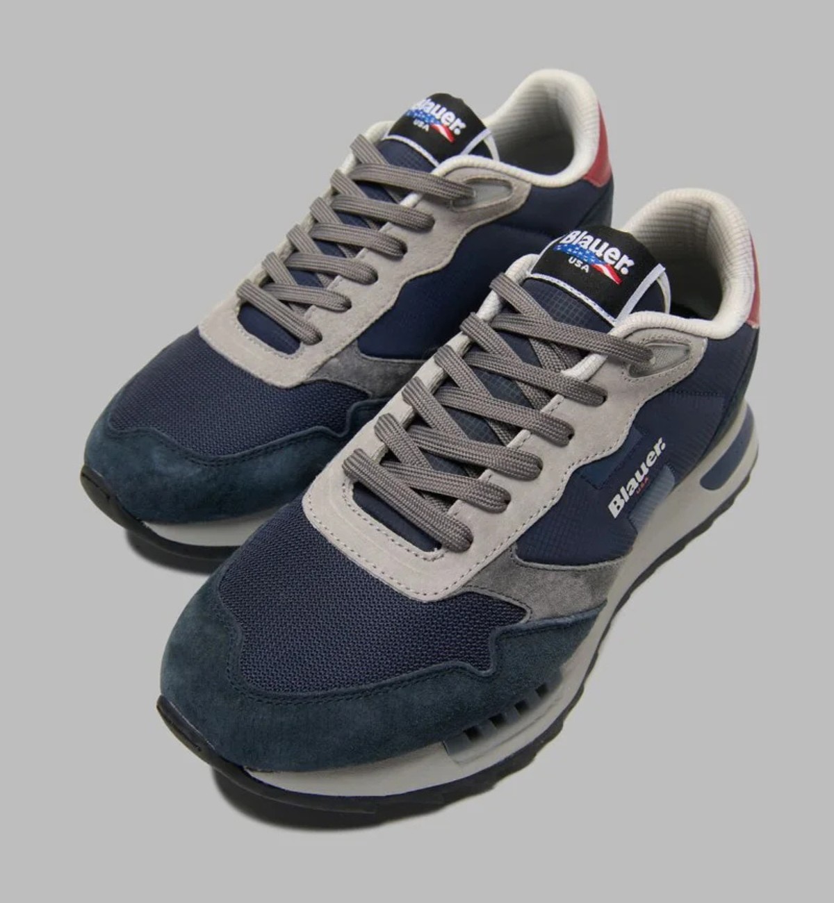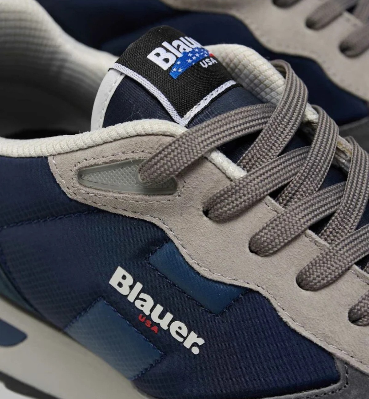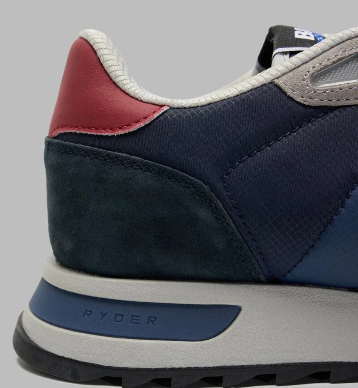 Sneakers RYDER dal design sportivo con un tocco vintage. La tomaia combina materiali diversi, con un effetto cromatico equilibrato, il logo Blauer è visibile lateralmente e sulla linguetta. La suola in eva con elementi a contrasto, è seghettata per un look dinamico