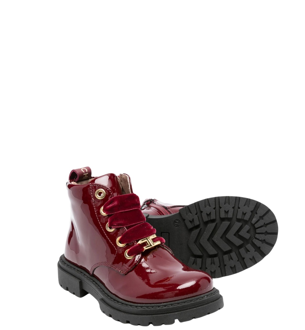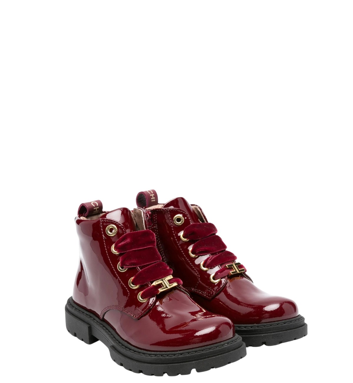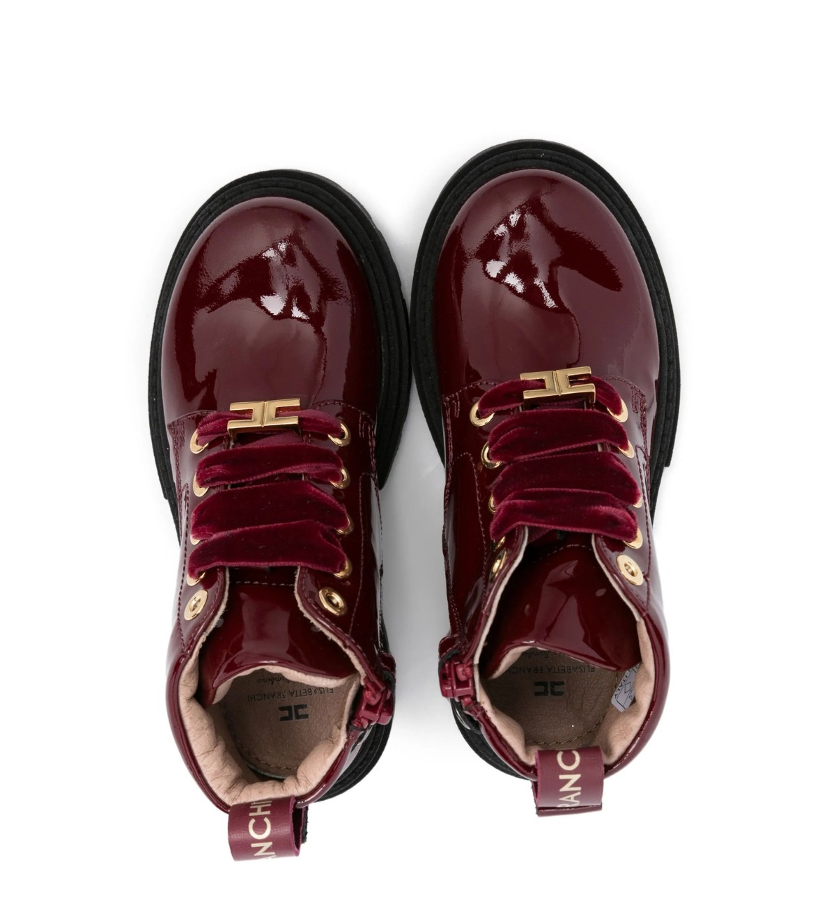 Elisabetta Franchi anfibi baby in pelle vernice bordeaux da bambina, con zip laterale, laccio in velluto e fondo in gomma