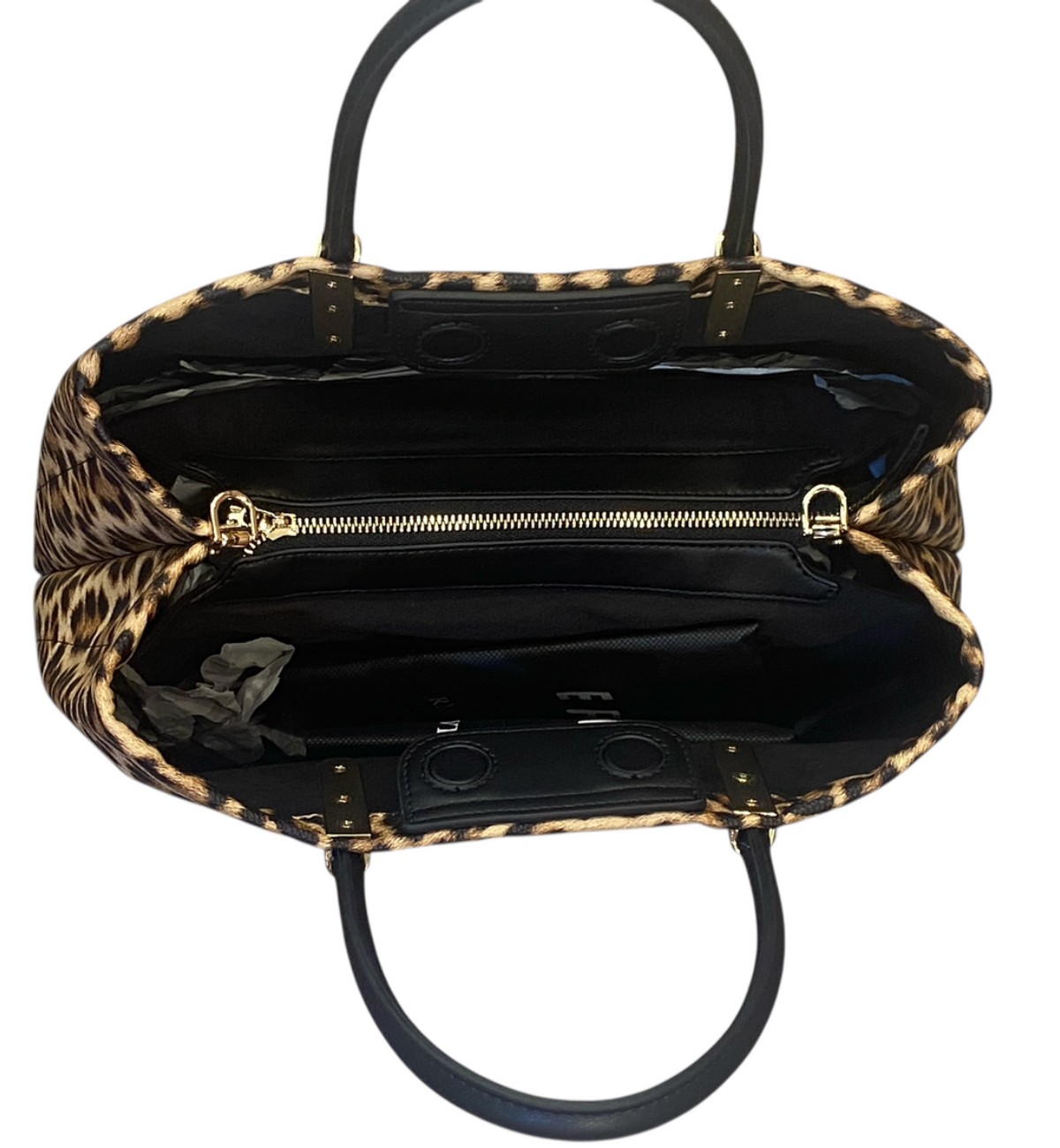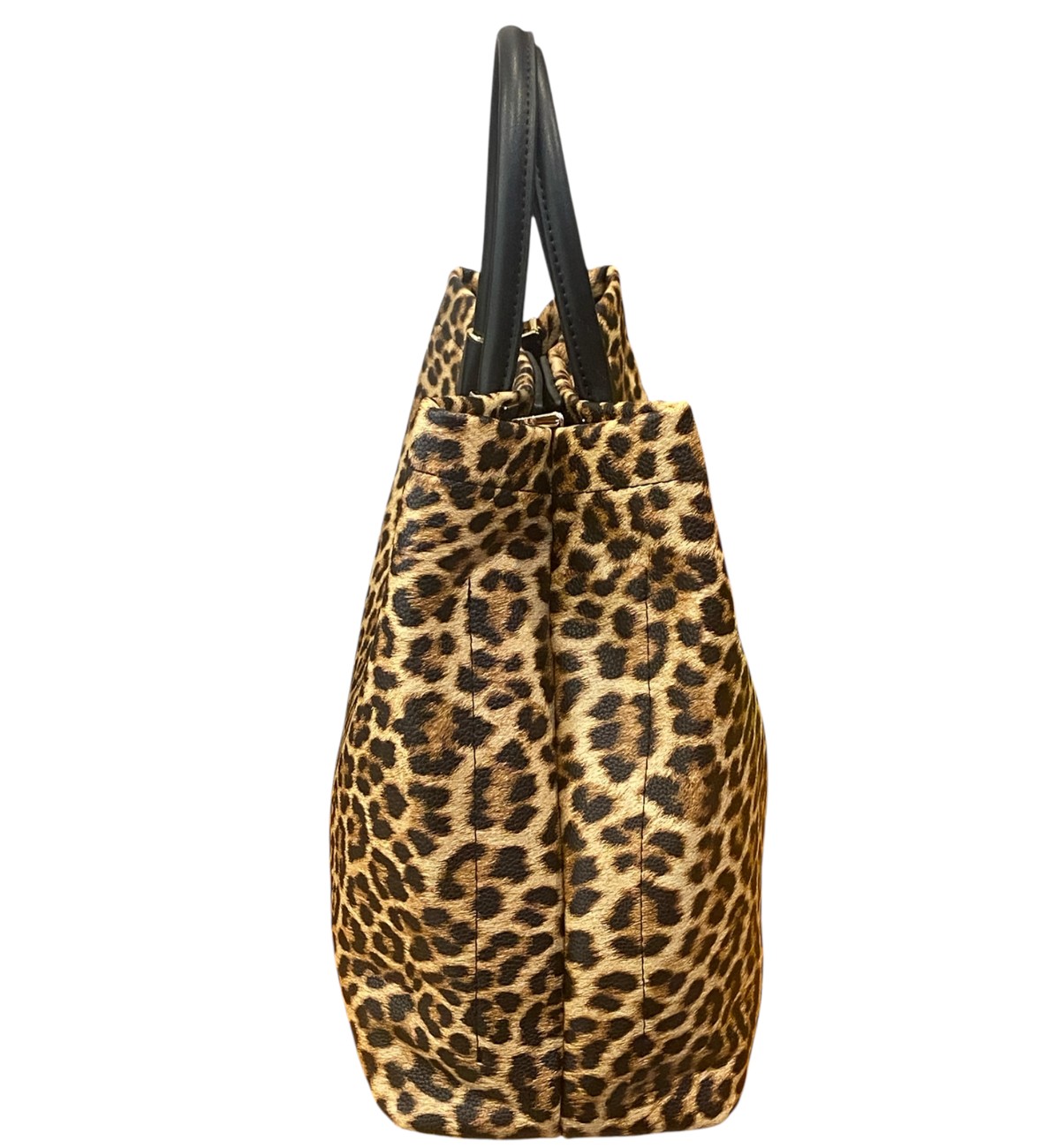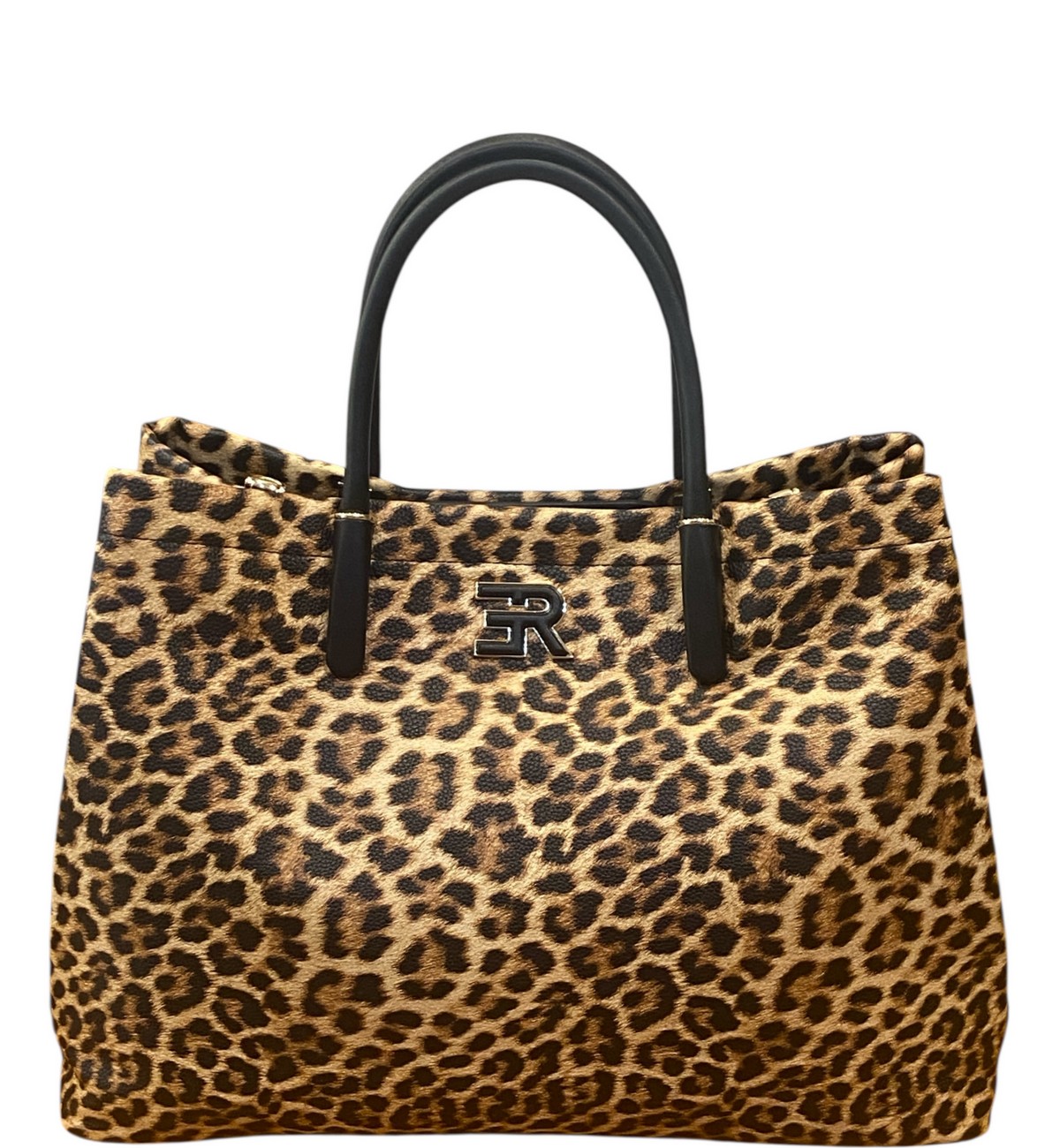 Borsa a due manici realizzata in resistente e morbido materiale sintetico a stampa animalier. L'articolo ha ben tre scomparti di cui, il principale, chiso con cerniera lampo.La borsa e' dotata anche di tracolla a nastro logata regolabile e removibile. Logo lettering frontale e posteriore. DIMENSIONI: 38x27x14 cm