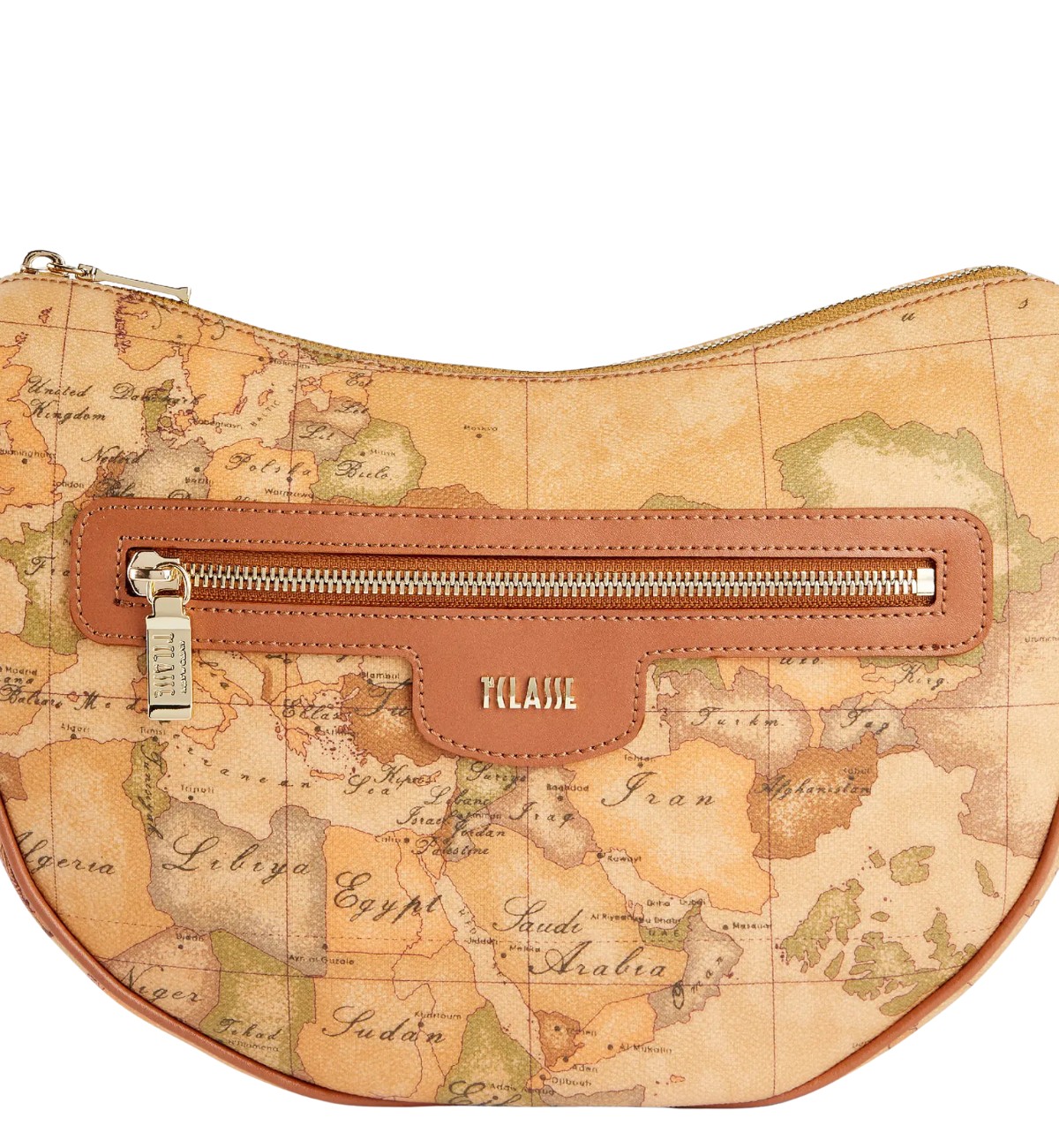 Tracollina a mezzaluna in tessuto Geo Classic Logo 1ᴬ Classe frontale con finitura in oro chiaro protetto Metalleria logata con finitura in oro chiaro protetto Dettagli in pelle liscia color Cuoio Una tasca frontale chiusa con zip Dimensione: 28x20x8 cm