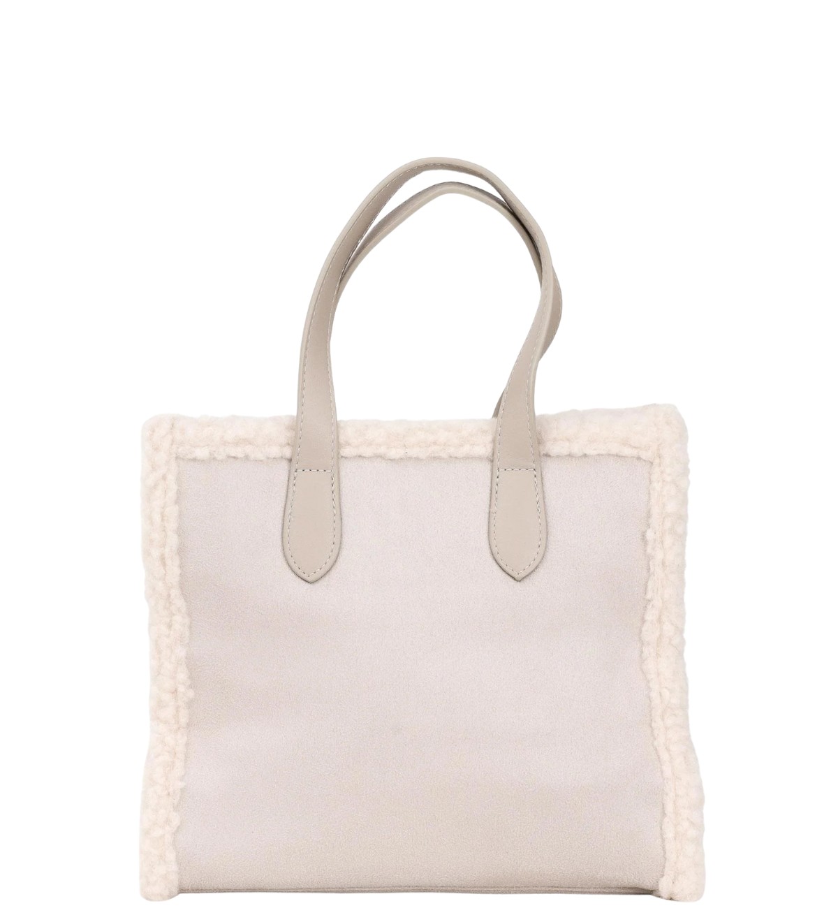 MARC ELLIS Borsa a mano Buby Suede M in morbido suede marrone da donna con profili in shearling a contrasto, perfetta per la stagione fredda.