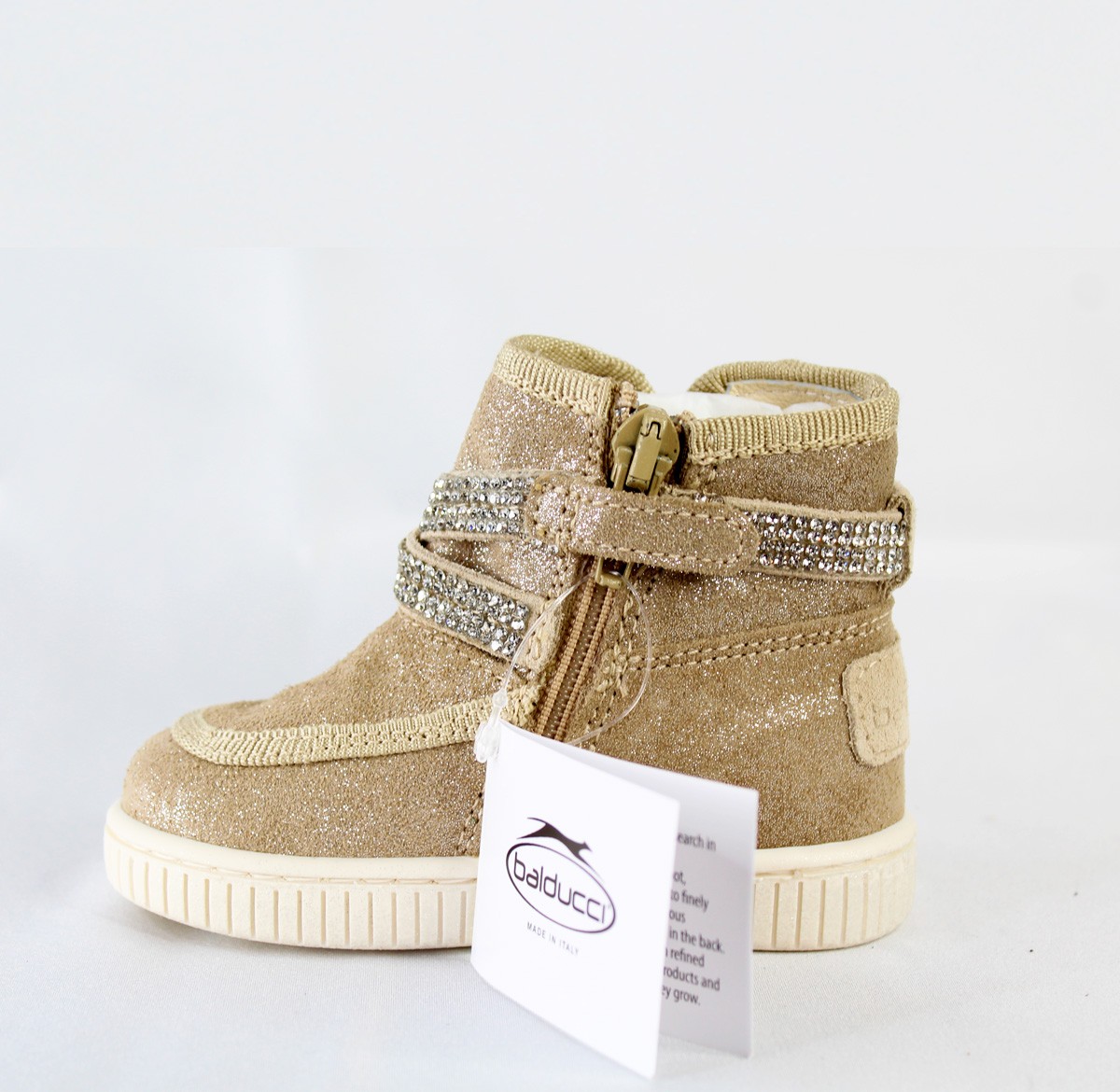 BALDUCCI Stivaletto primi passi Bambina con tomaia brillantinata beje, bracciale gioiello davanti e zip con strappo al lato. Fondo in gomma. Suoletta con arcata plantare in pelle
