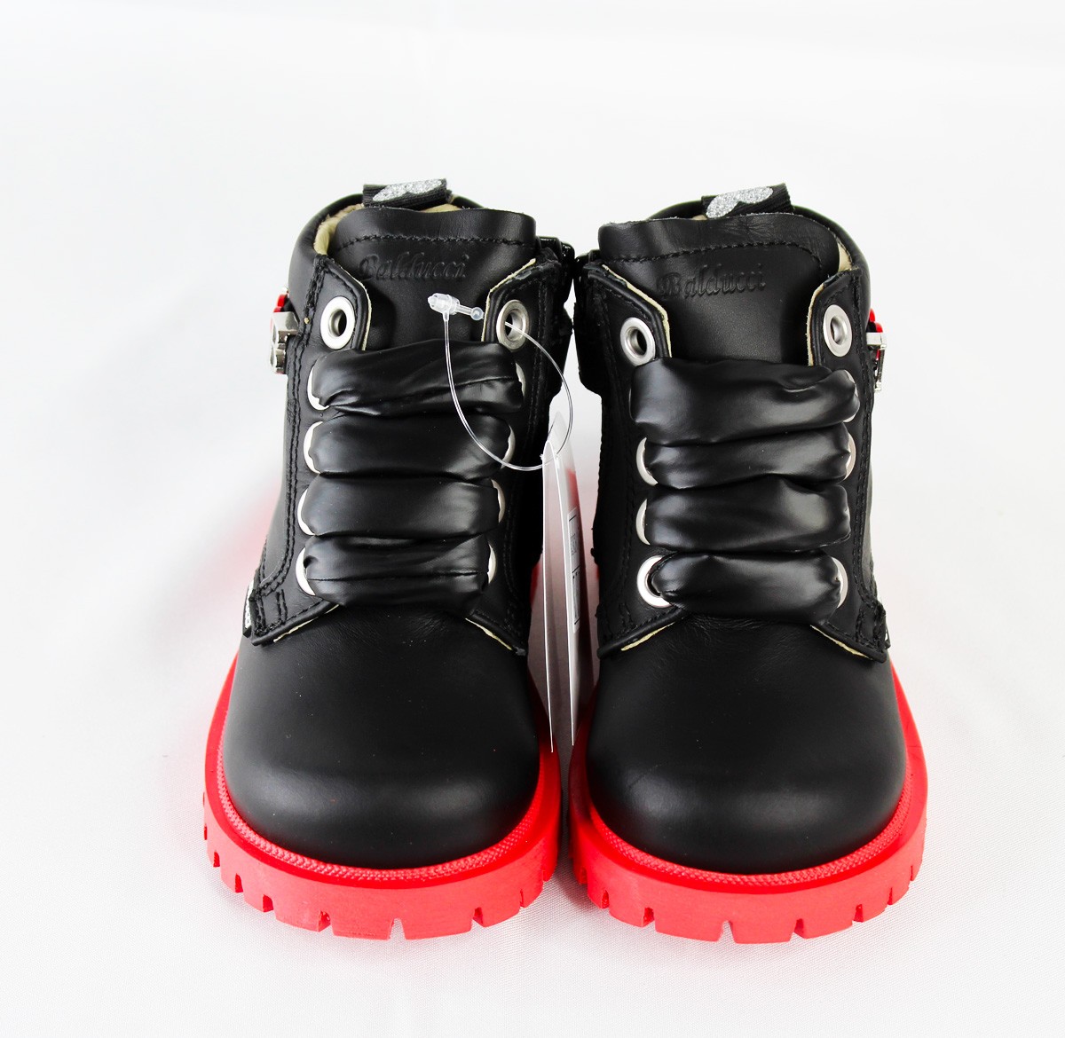 BALDUCCI Anfibietto primi passi Bambina in pelle nero con laccio particolare rosso (più laccio in cotone di ricambio), zip al lato con strappo, banda sul retro con cuoricino argentato e fondo in gomma. Suoletta con arcata plantare in pelle