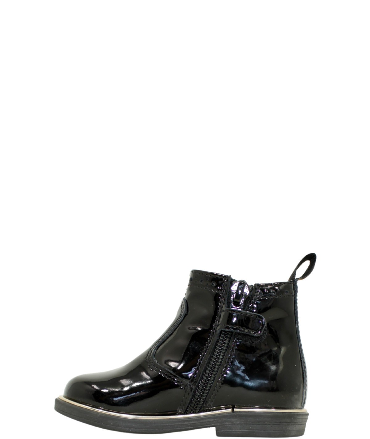 Stivaletti Balducci primi passi in Vernice Nero Bambina, in vernice color nero tinta unita.Dettaglio laterale applicazione fiori tinta su tinta.Fondo in gomma antiscivolo.Chiusura laterale con zip. Calzata regolare.
