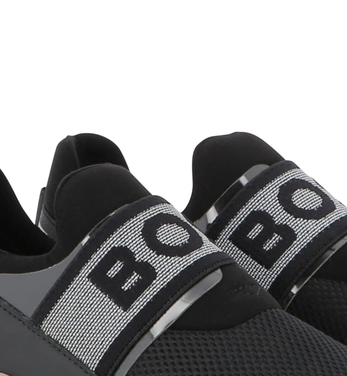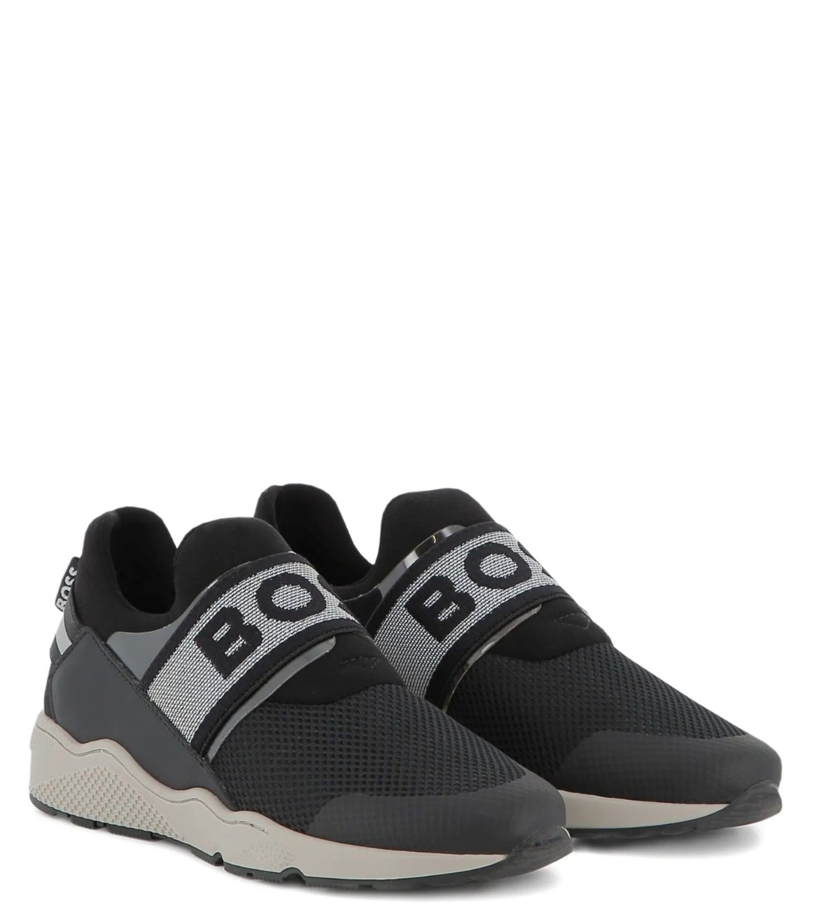Boss Sneakers nera in pelle e tessuto elastico molla, logo BOSS e fondo in gomma