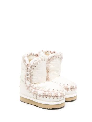 Bianco gesso, grigio talpa, pelle di pecora, lana, effetto stropicciato, rifinitura crochet, applicazione posteriore con logo, punta tonda, design slip-on, suola piatta in gomma e fodera in shearling.