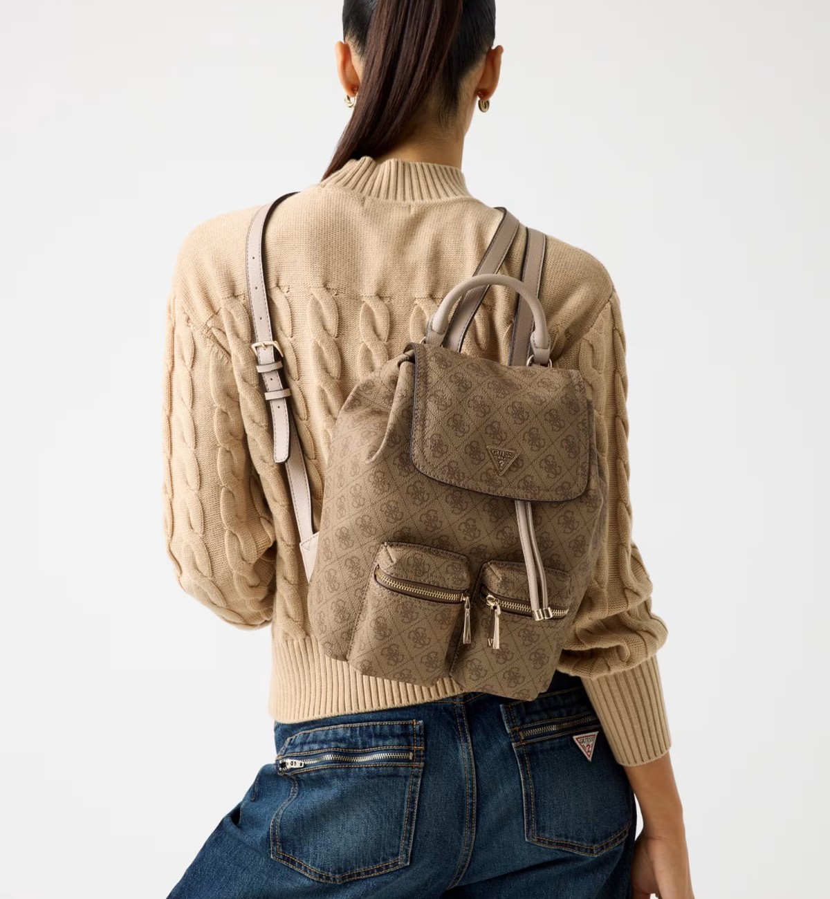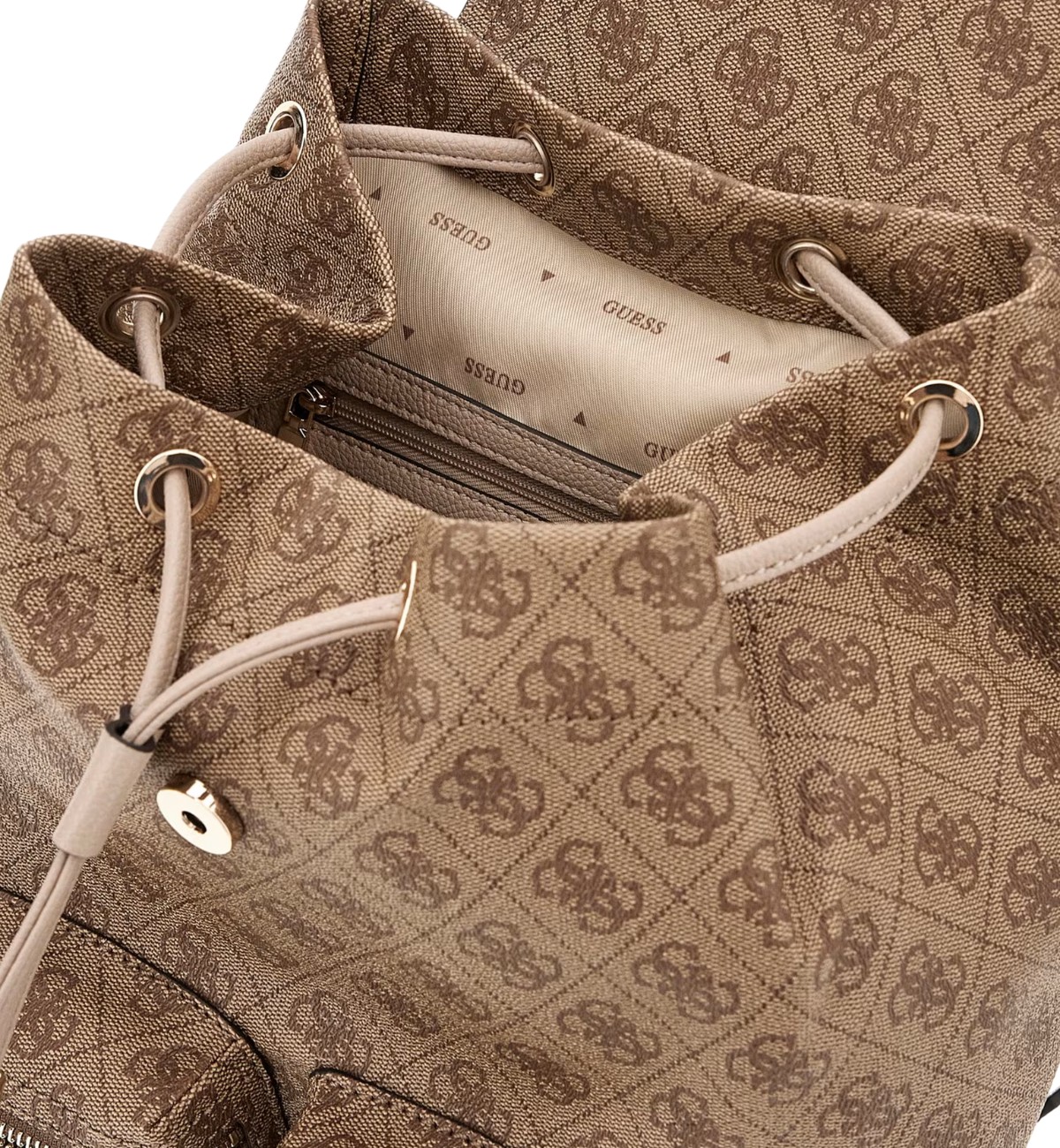 Mini zaino Manhattan 4G logo Guess, esterno in similpelle logato chiusura con coulisse e metalleria color oro pallido